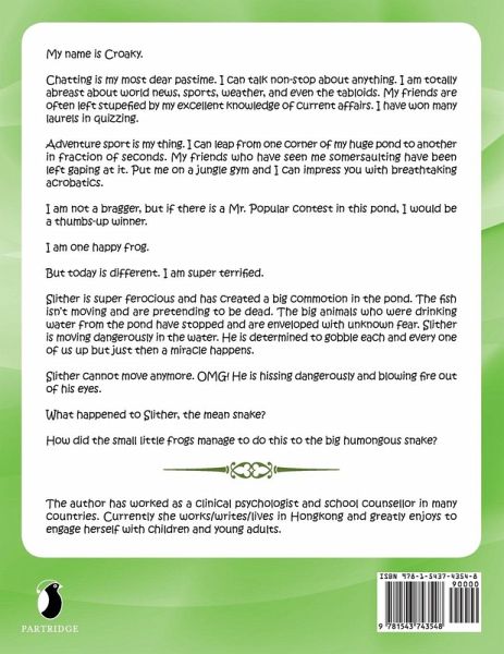 My name is Croaky. Chatting is my most dear pastime. I can talk non-stop about anything. I am totally abreast about world news, sports, weather, and even the tabloids. My friends are often left stupefied by my excellent knowledge of current affairs. I have won many laurels in quizzing. Adventure sport is my thing. I can leap from one corner of my huge pond to another in fraction of seconds. My friends who have seen me somersaulting have been left gaping at it. Put me on a jungle gym and I can impress you with breathtaking acrobatics. I am not a bragger, but if there is a Mr. Popular contest in this pond, I would be a thumbs-up winner. I am one happy frog. But today is different. I am super terrified. Slither is super ferocious and has created a big commotion in the pond. The fish isn’t moving and are pretending to be dead. The big animals who were drinking water from the pond have stopped and are enveloped with unknown fear. Slither is moving dangerously in the water. He is determined to gobble each and every one of us up but just then a miracle happens. Slither cannot move anymore. OMG! He is hissing dangerously and blowing fire out of his eyes. What happened to Slither, the mean snake? How did the small little frogs manage to do this to the big humongous snake?