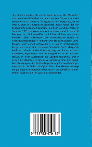 Es ist alles bunter, als ich bis dahin kannte. Die Menschen machen einen fröhlichen und entspannten Eindruck, nur verstehen kann ich sie nicht. Malgorzata, nun Margarete, ist mit ihrer Mutter in Deutschland gelandet. Beide haben das von Lebensmittelknappheit geprägte, politisch unruhige Polen im Sommer 1981 verlassen, um sich in einem Land, in dem die Morgen nach Bohnenkaffee und Rührei duften, ein neues, besseres Leben aufzubauen. Die bürokratischen Hürden im Grenzdurchgangslager Friedland und der Landesstelle Unna-Massen sind schnell überwunden. Es folgen anstrengende, karge Jahre und eine freudlose Schulzeit. Doch Margarete beißt sich durch, findet Unterstützung und kann mit Hartnäckigkeit, Engagement und Aufstiegswillen in der Handelsschule, in ihrer Ausbildung zur Speditionskauffrau und in ersten Berufsjahren in einem Versandbüro einer Lkw-Spedition überzeugen, bis Sie ihre Begeisterung für den Gefahrgut-Transport in die Selbstständigkeit führt. Ihre Geschichte zeigt die gelungene Integration einer Frau ,die schließlich unvermittelt wieder zu ihren Wurzeln zurückfindet.