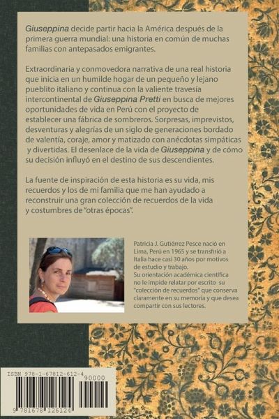 Giuseppina decide partir hacia la América después de la primera guerra mundial: una historia en común de muchas familias con antepasados emigrantes: Extraordinaria y conmovedora narrativa de una real historia que inicia en un humilde hogar de un pequeño y lejano pueblito italiano y continua con la valiente travesía intercontinental de Giuseppina Pretti en busca de mejores oportunidades de vida en Perú con el proyecto de establecer una fábrica de sombreros. Sorpresas, imprevistos, desventuras y alegrías de un siglo de generaciones bordado de valentía, coraje, amor y matizado con anécdotas simpáticas y divertidas. El desenlace de la vida de Giuseppina y de cómo su decisión influyó en el destino de sus descendientes. La fuente de inspiración de esta historia es su vida, mis recuerdos y los de mi familia que me han ayudado a reconstruir una gran colección de recuerdos de la vida y costumbres de "otras épocas".