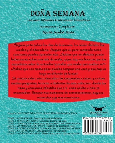 Las canciones infantiles tradicionales son un tesoro cultural, salvaguardarlas y ensenarlas a las nuevas generaciones es nuestro deber. Doña Semana hace exactamente eso. Es el tomo uno de una colección de 7 libros, llamada "Canciones Infantiles Tradicionales Dominicanas"; este tomo tiene como enfoque las "Canciones Infantiles Tradicionales Educativas". Doña Semana consta con las letras de 34 canciones tradicionales infantiles, cada una con sus partituras musicales, con algunas ilustraciones, e información adicional como son: La dinámica del juego, el objetivo educativo de la canción y comentarios que muchas veces incluye lugares donde se cantan las canciones, origen de las mismas y más; además, en la introducción comparto un contenido educativo relacionado con las canciones infantiles, sus orígenes, elementos, rasgos y beneficios para los niños. Esta colección fue investigada, compilada y escrita por la autora y poeta dominicana Maria Aduke Alabi, con prólogo del muy reconocido autor, sociólogo, folklorista y escritor dominicano Dagoberto Tejeda Ortiz, con ilustración de la dibujante Mexicana Scarlett Briseño Peñaloza y la creación de las partituras musicales hechas por la compositora y productora argentina Lucia Genes, editado por el Narrador, periodista y editor cubano, Lic. Rafael José Rodríguez Pérez. El propósito de esta compilación folklorica es la de divulgar y al mismo tiempo salvaguardar ese tesoro cultural que forma parte importante del folklore infantil latino como lo son las canciones infantiles, las cuales lastimosamente en estos tiempos están desapareciendo del repertorio infantil de los niños dentro y fuera de la isla Quisqueyana. Por lo que su rescate se ha vuelto una tarea que la autora ha tomado de forma muy personal. Platón, uno de los filósofos más sobresalientes que ha dado la humanidad, defendía la utilización de la música antes que cualquier otra arte para la educación, pues para él la formación del alma debe ir primero que la formación del cuerpo. Este primer volumen contiene canciones como son: La vaca lechera, Sal solecito, Pulgarcito, Pollito chicken, París se quema, La mar estaba serena, Viajar en tren, Una mosca, Debajo de un botón, Juan Paco Pedro, Brinca la tablita, Yo tenía diez perritos, Los esqueletos, Un elefante se balanceaba, Con medio peso, Hay un hoyo en el fondo de la mar, Chivita, chivita, La feria del maestro Andrés, entre otras. Cada uno de estos cánticos infantiles, independientemente de su contenido lúdico, contribuye con la educación básica infantil y ayuda a los niños a integrarse con otros, impulsa el desarrollo de destrezas del lenguaje y fomenta el trabajo en grupo y el sentido de la colaboración, coordinación y desarrollo motor. Colabora con canciones. Únete a nuestro grupo de Facebook. Para más información.