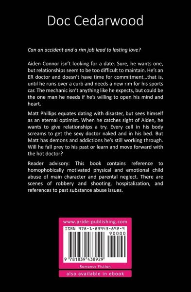 Can an accident and a rim job lead to lasting love? Aiden Connor isn’t looking for a date. Sure, he wants one, but relationships seem to be too difficult to maintain. He’s an ER doctor and doesn’t have time for commitment…that is, until he runs over a curb and needs a new rim for his sports car. The mechanic isn’t anything like he expects, but could be the one man he needs if he’s willing to open his mind and heart. Matt Phillips equates dating with disaster, but sees himself as an eternal optimist. When he catches sight of Aiden, he wants to give relationships a try. Every cell in his body screams to get the sexy doctor naked and in his bed. But Matt has demons and addictions he’s still working through. Will he fall prey to his past or learn and move forward with the hot doctor?