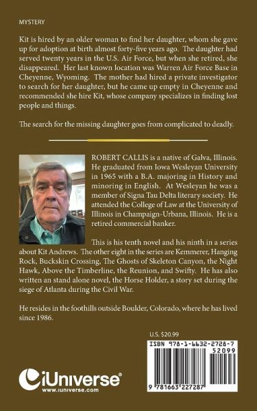 Kit is hired by an older woman to find her daughter, whom she gave up for adoption at birth almost forty-five years ago. The daughter had served twenty years in the U.S. Air Force, but when she retired, she disappeared. Her last known location was Warren Air Force Base in Cheyenne, Wyoming. The mother had hired a private investigator to search for her daughter, but he came up empty in Cheyenne and recommended she hire Kit, whose company specializes in finding lost people and things. The search for the missing daughter goes from complicated to deadly.