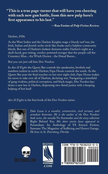 Harlem, 1926. As the West Indies and the Harlem Knights wage a bloody turf war, the Irish, Italian and Jewish mobs circle like sharks and a helpless community bleeds. But one of Harlem's darkest denizens has been called by the old gods in answer to the people's prayers for help. He stalks Harlem's night as a skull-faced, gun-toting, voodoo-powered avenger that the people call the Cemetery Man... the Witch Doctor... the Dread Baron... ??But you can just call him Doc Voodoo. ? ?In Aces & Eights the Queen Bee controls the speakeasies, brothels and numbers rackets in north Harlem; Papa House controls the south. As the Queen Bee puts the final touches on her new night club, Papa House makes his move to take over all of Harlem, declaring war. But Doc Voodoo is conjuring the Loas and getting horsed to maintain peace, prosperity, and autonomy for the residents of Harlem. Navigating a minefield of gang rivalries, political corruption, and black magic, Doc Voodoo lays down a new law in Harlem, dispensing two-fisted justice with a heaping helping of hot lead! ??Aces & Eights is the first book of the Doc Voodoo series. ? ?Jam-packed with mobsters, mystery, magic and mayhem, Dale Lucas offers a new twist on the action hero and a love letter to classic pulp fiction.