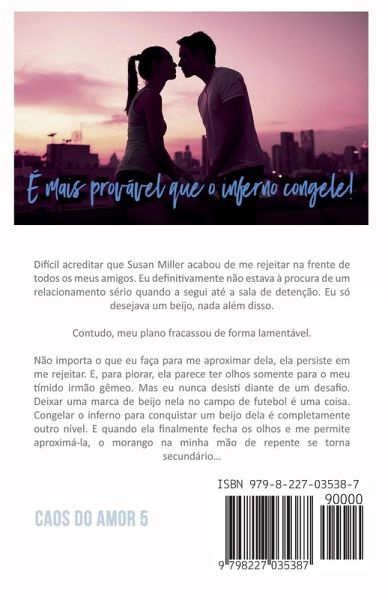 "É mais provável que o inferno congele!" Difícil acreditar que Susan Miller acabou de me rejeitar na frente de todos os meus amigos. Eu definitivamente não estava à procura de um relacionamento sério quando a segui até a sala de detenção. Eu só desejava um beijo, nada além disso. Contudo, meu plano fracassou de forma lamentável. Não importa o que eu faça para me aproximar dela, ela persiste em me rejeitar. E, para piorar, ela parece ter olhos somente para o meu tímido irmão gêmeo. Mas eu nunca desisti diante de um desafio. Deixar uma marca de beijo nela no campo de futebol é uma coisa. Congelar o inferno para conquistar um beijo dela é completamente outro nível. E quando ela finalmente fecha os olhos e me permite aproximá-la, o morango na minha mão de repente se torna secundário... __________________________ Atenção: Esta é uma reedição da série "Grover Beach Team", anteriormente publicada pela Editora Bezz! Todos os livros da série CAOS DO AMOR podem ser lidos como romances independentes! Ordem cronológica: 1. Belo Desastre 2. Catástrofe do Amor 3. Inimigos e Mais 4. Um Bad Boy para Sue 5. Doce e Proibido ~*~ 6. Aposta Impossível 7. Gata Indomável