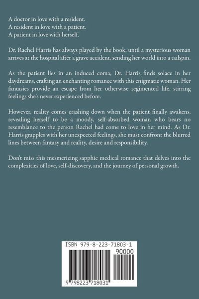 A doctor in love with a resident. A resident in love with a patient. A patient in love with herself. Dr. Rachel Harris has always played by the book, until a mysterious woman arrives at the hospital after a grave accident, sending her world into a tailspin. As the patient lies in an induced coma, Dr. Harris finds solace in her daydreams, crafting an enchanting romance with this enigmatic woman. Her fantasies provide an escape from her otherwise regimented life, stirring feelings she's never experienced before. However, reality comes crashing down when the patient finally awakens, revealing herself to be a moody, self-absorbed woman who bears no resemblance to the person Rachel had come to love in her mind. As Dr. Harris grapples with her unexpected feelings, she must confront the blurred lines between fantasy and reality, desire and responsibility. Don't miss this mesmerizing sapphic medical romance that delves into the complexities of love, self-discovery, and the journey of personal growth.