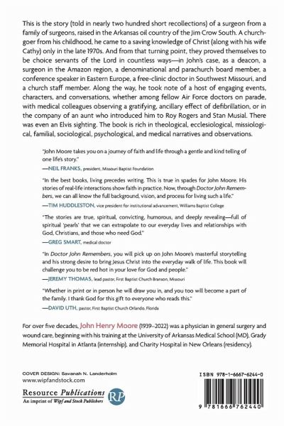 This is the story (told in nearly two hundred short recollections) of a surgeon from a family of surgeons, raised in the Arkansas oil country of the Jim Crow South. A churchgoer from his childhood, he came to a saving knowledge of Christ (along with his wife Cathy) only in the late 1970s. And from that turning point, they proved themselves to be choice servants of the Lord in countless ways--in John's case, as a deacon, a surgeon in the Amazon region, a denominational and parachurch board member, a conference speaker in Eastern Europe, a free-clinic doctor in Southwest Missouri, and a church staff member. Along the way, he took note of a host of engaging events, characters, and conversations, whether among fellow Air Force doctors on parade, with medical colleagues observing a gratifying, ancillary effect of defibrillation, or in the company of an aunt who introduced him to Roy Rogers and Stan Musial. There was even an Elvis sighting. The book is rich in theological, ecclesiological, missiological, familial, sociological, psychological, and medical narratives and observations.