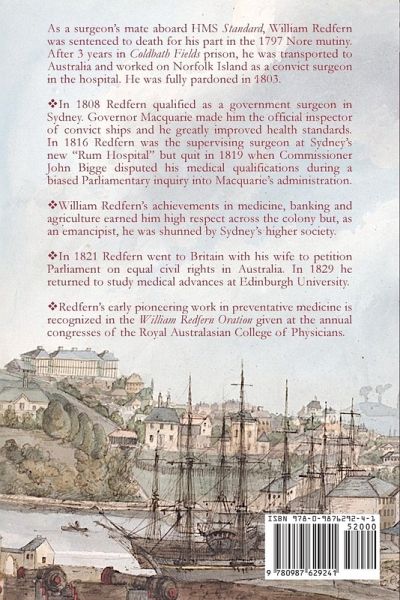 William Redfern is Australia's first medical graduate. His pioneering work in public health medicine is acknowledged with the William Redfern Oration given at the annual congress of the Royal Australasian College of Physicians. Redfern was a surgeon's mate aboard HMS Standard during the 1797 Nore mutiny. For his involvement he was sentenced to death and spent three years in Coldbath Fields prison, England's cruelest jail, before being transported to New South Wales. The opening chapters narrate Redfern's training as a surgeon; the Nore mutiny; his court-martial; his imprisonment in England and transportation to NSW. Redfern is sent to Norfolk Island as a convict to work as a surgeon in the hospital. He spends seven years there during the era of Joseph Foveaux, John Piper and surgeon D'Arcy Wentworth. He earns an absolute pardon; returns to Sydney following the overthrow of Governor William Bligh and is appointed surgeon at the old George Street hospital. He treats the imprisoned Bligh, who had been a captain aboard a ship involved in the Nore mutiny. Governor Macquarie makes him the health inspector of convict ships and Redfern becomes his personal physician and a close confidant of Macquarie. Redfern helps plan Sydney's "Rum hospital" and is the supervising surgeon there; also has a large private medical practice. In 1819 he resigns from the hospital when not appointed as Principal Surgeon and quits medicine after Commissioner Bigge, who was inquiring into Macquarie's liberal emancipist policies, questions his abilities and qualifications. Bigge also cancels his appointment as magistrate. The tumultuous early colonial years in New South Wales are revealed through Redfern's personal life and medical experiences. The closing chapters describe Redfern's successes in medicine, banking and agriculture. He becomes one of the most respected members in the colony but, as an emancipist, he was shunned socially. He becomes an activist for emancipist civil rights and sails to London with Edward Eagar to petition the British Parliament. Years later William Redfern enrolls in medical studies at Edinburgh University while overseeing the education of his oldest son.