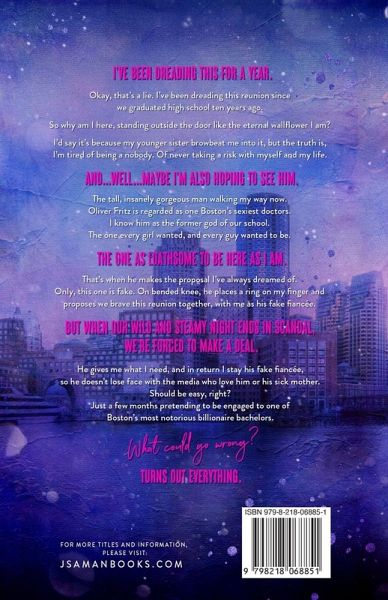 I've been dreading this for a year. Okay, that's a lie. I've been dreading this reunion since we graduated high school ten years ago. So why am I here, standing outside the door like the eternal wallflower I am? I'd say it's because my younger sister browbeat me into it, but the truth is, I'm tired of being a nobody. Of never taking a risk with myself and my life. And...well...maybe I'm also hoping to see him. The tall, insanely gorgeous man walking my way now. Oliver Fritz is regarded as one of Boston's sexiest doctors. I know him as the former god of our school. The one every girl wanted, and every guy wanted to be. The one as unhappy to be here as I am. That's when he makes the proposal I've always dreamed of. Only, this one is fake. On bended knee, he places a ring on my finger and proposes we brave this reunion together, with me as his fake fiancée. But when our wild and steamy night ends in scandal, we're forced to make a deal. He gives me what I need, and in return I stay his fake fiancée, so he doesn't lose face with the media who love him or his sick mother. Should be easy, right? Just a few months pretending to be engaged to one of Boston's most notorious billionaire bachelors. What could go wrong? Turns out everything.