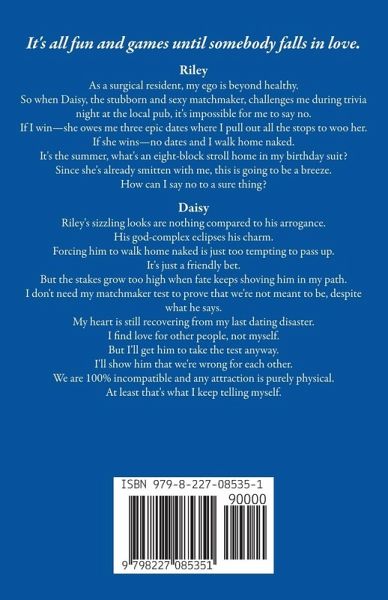 It's all fun and games until somebody falls in love. Riley As a surgical resident, my ego is beyond healthy. So when Daisy, the stubborn and sexy matchmaker, challenges me during trivia night at the local pub, it's impossible for me to say no. If I win-she owes me three epic dates where I pull out all the stops to woo her. If she wins-no dates and I walk home naked. It's the summer, what's an eight-block stroll home in my birthday suit? Since she's already smitten with me, this is going to be a breeze. How can I say no to a sure thing? Daisy Riley's sizzling looks are nothing compared to his arrogance. His god-complex eclipses his charm. Forcing him to walk home naked is just too tempting to pass up. It's just a friendly bet. But the stakes grow too high when fate keeps shoving him in my path. I don't need my matchmaker test to prove that we're not meant to be, despite what he says. My heart is still recovering from my last dating disaster. I find love for other people, not myself. But I'll get him to take the test anyway. I'll show him that we're wrong for each other. We are 100% incompatible and any attraction is purely physical. At least that's what I keep telling myself. **Note, although this book is a standalone, you can find characters that appear in this book in both Snowed In & Set Up, and Hot Dad.