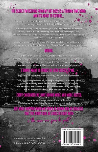 The secret I'm keeping from my hot boss is a ticking time bomb. And it's about to explode... Running out on my wedding and throwing myself onto his car to get away from my cheating ex is not how I thought I'd see Kaplan Fritz again. Which is probably why I didn't recognize him until I ran into his mother shortly after. A hell of a morning and a bottle of champagne later and I'm accepting a job I likely shouldn't-working for his family's foundation as their new executive assistant. Now I'm in a new city, living a new life, determined that this will be the start of a new me, while foolishly assuming I'll never have to see Kaplan again. Wrong. Sitting high up on his throne, Doctor Untouchable with his boyishly handsome face, piercing green eyes, and jawline that could sharpen a knife can make a girl blush and her panties melt just by walking past her. Everyone wants a piece of Boston's last eligible billionaire bachelor. I simply want to forget he ever existed to me. Especially when it turns out he's nothing like the man I remember. Cold, aggravatingly closed off, and infuriatingly cocky, his sexy smirk grates on my every nerve. The pediatric cardiothoracic surgeon has no time or patience for me, his lowly assistant trying to help him run his family's foundation that he's now the CEO of. Every encounter we have grows more and more heated. Every fiery exchange a twisted form of foreplay. Which is why I'm determined he never discover the truth about me. But what happens when my cover is blown and he realizes that the curvy girl he loves to fight with is the same one from his past?