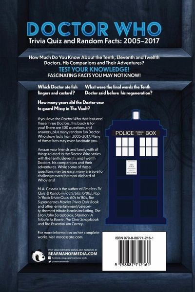How Much Do You Know About the Tenth, Eleventh and Twelfth Doctors, His Companions and Their Adventures? TEST YOUR KNOWLEDGE! FASCINATING FACTS YOU MAY NOT KNOW! Which Doctor ate fish Fingers and custard? What were the final works the tenth Doctor said before his regeneration? How many years did the Doctor vow to guard Missy in The Vault? If you love the Doctor Who that featured these three Doctors, this book is for you! There are 300 questions and answers, plus many random fun Doctor Who show facts from 2005-2017. Many of these facts may even fascinate you. Amaze your friends and family with all things related to the Doctor Who series with the Tenth, Eleventh, and Twelfth Doctors, his companions and their adventures. While some of these questions may be easy, many are sure to challenge even the most diehard of Whovians! M.A. Cassata is the author of Timeless TV Quiz & Random Facts:'60s to'80s, Pop 'n' Rock Trivia Quiz: '60s to'80s , The Superheroes Movies Trivia Quiz Book and other entertainment/celebrity-themed tribute books including, The Elton John Scrapbook , Starman: A Tribute to Bowie , The Cher Scrapbook and The Essential Jim Carrey.
