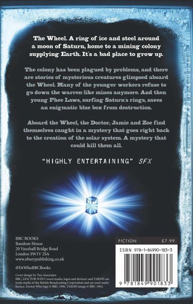 The Wheel. A ring of ice and steel around a moon of Saturn and home to a mining colony supplying Earth. It's a bad place to grow up. The colony has been plagued by problems and there are stories of mysterious creatures glimpsed aboard the Wheel. Many of the younger workers refuse to go down the warren-like mines anymore. And then young Phee Laws surfing Saturn's rings saves an enigmatic blue box from destruction. Aboard the Wheel the Doctor Jamie and Zoe find themselves caught in a mystery that goes right back to the creation of the solar system. A mystery that could kill them all.