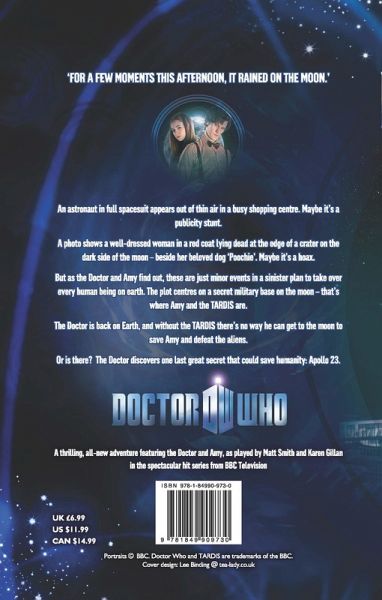 'For a few moments this afternoon it rained on the moon...' An astronaut in full spacesuit appears out of thin air in a busy shopping centre. Maybe it's a publicity stunt. A photo shows a well-dressed woman in a red coat lying dead at the edge of a crater on the dark side of the moon - beside her beloved dog 'Poochie'. Maybe it's a hoax. But as the Doctor and Amy find out these are just minor events in a sinister plan to take over every human being on earth. The plot centres on a secret military base on the moon - that's where Amy and the TARDIS are. The Doctor is back on Earth and without the TARDIS there's no way he can get to the moon to save Amy and defeat the aliens. Or is there? The Doctor discovers one last great secret that could save humanity: Apollo 23. A thrilling all new adventure featuring the Doctor and Amy as played by Matt Smith and Karen Gillan in the hit Doctor Who series from BBC Television