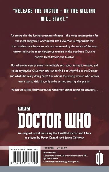 Release the Doctor or the killing will start. An asteroid in the furthest reaches of space the most secure prison for the most dangerous of criminals. The Governor is responsible for the cruellest murderers so he's not impressed by the arrival of the man they're calling the most dangerous criminal in the quadrant. Or as he prefers to be known the Doctor. But when the new prisoner immediately sets about trying to escape and keeps trying the Governor sets out to find out why. Who is the Doctor and what's he really doing here? And who is the young woman who comes every day to visit him only to be turned away by the guards? When the killing finally starts the Governor begins to get his answers&