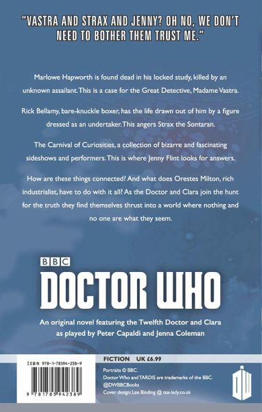 Vastra and Strax and Jenny? Oh no we don't need to bother them. Trust me. Marlowe Hapworth is found dead in his locked study killed by an unknown assailant. This is a case for the Great Detective Madame Vastra. Rick Bellamy bare-knuckle boxer has the life drawn out of him by a figure dressed as an undertaker. This angers Strax the Sontaran. The Carnival of Curiosities a collection of bizarre and fascinating sideshows and performers. This is where Jenny Flint looks for answers. How are these things connected? And what does Orestes Milton rich industrialist have to do with it all? As the Doctor and Clara joint the hunt for thr truth they find themselves thrust into a world where nothing and no one are what they seem.