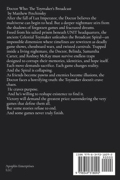 Doctor Who: The Toymaker's Broadcast by Matthew Petchinsky After the fall of Lux Imperator, the Doctor believes the multiverse can begin to heal. But a deeper nightmare stirs from the shadows of forgotten games and fractured dreams. Freed from his salted prison beneath UNIT headquarters, the ancient Celestial Toymaker unleashes the Broadcast Spiral-an impossible dimension where timelines are rewritten as deadly game shows, chessboard wars, and twisted carnivals. Trapped inside a living nightmare, the Doctor, Belinda, Samantha Carter, and Rodney McKay must survive endless traps designed to corrupt their memories, identities, and hope itself. Each move demands sacrifice. Each game changes reality. And the Spiral is collapsing. As friends become pawns and enemies become illusions, the Doctor faces a horrifying truth: the Toymaker doesn't crave chaos. He craves purpose. And he's willing to reshape existence to find it. Victory will demand the greatest price: surrendering the very games that define them all. But some stories refuse to end. And some games never truly finish.