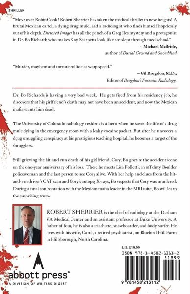 "Move over Robin Cook! Robert Sherrier has taken the medical thriller to new heights! A brutal Mexican cartel, a dying drug mule, and a radiologist who finds himself hopelessly out of his depth. Doctored Images has all the punch of a Greg Iles mystery and a protagonist in Dr. Bo Richards who makes Kay Scarpetta look like she slept through med school." -- Michael McBride, author of Burial Ground and Snowblind "Murder, mayhem and torture collide at warp speed." - Gil Brogdon, M.D., Editor of Brogdon's Forensic Radiology. Dr. Bo Richards is having a very bad week. He gets fired from his residency job, he discovers that his girlfriend's death may not have been an accident, and now the Mexican mafia wants him dead. The University of Colorado radiology resident is a hero when he saves the life of a drug mule dying in the emergency room with a leaky cocaine packet. But after he uncovers a drug smuggling conspiracy at his prestigious teaching hospital, he becomes a target of the smugglers. Still grieving the hit and run death of his girlfriend, Cory, Bo goes to the accident scene on the one-year anniversary of his loss. There he meets Lisa Folletti, an off duty Boulder policewoman and the last person to see Cory alive. With her help and clues from the hit-and-run driver's CAT scan and Cory's autopsy X-rays, Bo suspects that Cory was murdered. During a final confrontation with the Mexican mafia leader in the MRI suite, Bo will learn the surprising truth.