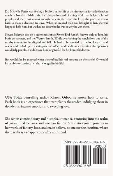 Dr. Michelle Peters was feeling a bit lost in her life as a chiropractor for a destination ranch in Northern Idaho. She had always dreamed of doing work that helped a lot of people, and there just weren't enough patients there, but she loved the place, so it was hard to make a decision to leave. When an injured man was brought to her, she was happy to help him, but she had no idea who he was or why he was there. Steven Pickman was on a secret mission at River's End Ranch, known only to him, his business partners, and the Weston family. While overlooking the ranch from one of the nearby mountains, he slipped and fell. He had to be rescued by the local search and rescue and ended up in a chiropractor's office, and he didn't even think chiropractors could help people. It didn't take him long to fall for his beautiful doctor. But would she be annoyed when she realized his real purpose on the ranch? Or would he be able to convince her she belonged in his life?