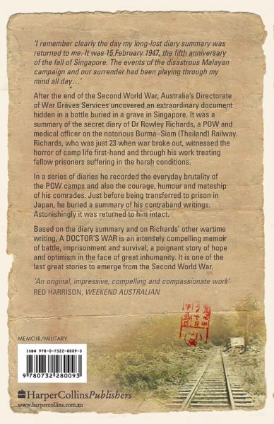 Eminent surgeon Rowley Richards was a young doctor and officer in the army reserve when war broke out. He embarked for Singapore in 1941, a year before the Allies capitulated to invading Japanese forces. Richards became a POW and, as a medical officer, found himself tending to other prisoners in shocking conditions. In a diary, he recorded the horrors he witnessed as well as the courage, humour and mateship of his fellow prisoners. As the Allies advanced, he buried his writings in a bottle in a soldier's grave and made a map of the site which, remarkably, stayed intact during his transfer and imprisonment in Japan. Dr Rowley Richards' memoir begins with his carefree childhood in Australia, covers time spent in conditions which could - and did - prove fatal to so many others, and describes a vigorous and busy post-war career as a doctor. An engagingly personal story, it's also a reflection on humanity and on the will to survive.