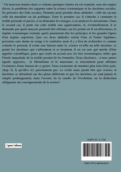 " On trouvera réunies dans ce volume quelques études où est examiné, sous des angles divers, le problème des rapports entre la science économique et les doctrines sociales. En présence des faits sociaux, l'homme peut prendre deux attitudes : celle du savant, celle du moraliste ou du politique. Dans le premier cas, il s'attache à connaître la réalité présente et passée, à en démonter les rouages, à en analyser le mécanisme. Dans le second cas, il porte sur cette réalité une appréciation, et, éventuellement, il se demande par quels moyens pourrait être réformé, sur les points où il est défectueux, le régime économique existant, quels pourraient être les principes et les grandes lignes d'un régime supérieur. Que ces deux attitudes soient l'une et l'autre légitimes, personne sans doute ne songe à le contester, mais il y a lieu de rechercher si, comme certains le pensent, il existe une liaison entre la .science et telle ou telle doctrine, si, parmi les doctrines qui s¿affrontent et se heurtent, il en est une qui mérite d'être appelée scientifique, parce que seule en accord avec les lois économiques, telles que l'étude impartiale de la réalité permet de les formuler. Deux doctrines, - à tous autres égards opposées, le libéralisme et le marxisme, se rencontrent pour affirmer l¿existence d'une liaison de ce genre. Nous essaierons de montrer plus loin (1ère part., chap. II, I) qu'elles n'y parviennent pas. La vérité nous paraît être que science et doctrines se déroulent sur des plans différents et que les doctrines ne sont jamais le simple prolongement, dans l'avenir, de la courbe de l'évolution, ou la déduction obligatoire des enseignements de la science"