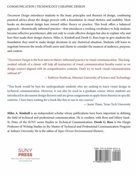 Introduces students to the basic principles and theories of design, combining practical advice about the design process with a foundation in visual rhetoric and usability. Document Design introduces students to the basic principles and theories of design, combining practical advice about the design process with a foundation in visual rhetoric and usability. Most books on document design lean toward either theory or practice. This book offers a balanced approach-theoretically informed practice-that introduces a working vocabulary to help students become reflective practitioners, able not only to create effective designs but also to explain why and how they made their design choices. Derek G. Ross and Miles A. Kimball hope to give students the foundation they need to make design decisions in any rhetorical situation. Students will learn to negotiate between the needs of both users and clients to consider the nuances of audience, purpose, and context.