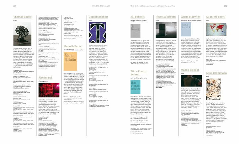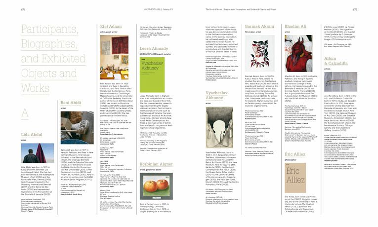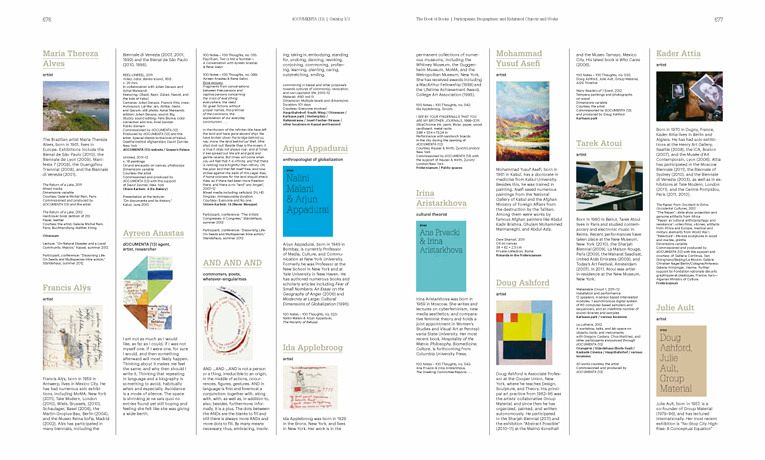 Die illustrierten Kurzbiografien aller Teilnehmer sind mit dem Katalog der ausgestellten Werke kombiniert und bieten einen Gesamtüberblick über die Spannbreite der dOCUMENTA (13). Eine ausführliche Leseliste sowie ein umfangreicher Index geben Hinweise zur Navigation dieses Buches sowie zur weiteren Vertiefung einzelner Themen aus dem Zusammenhang der Ausstellung. Dieser reich bebilderte Katalog ermöglicht einen tief reichenden Einblick in das Konzept der dOCUMENTA (13) mit ihren vielseitigen Verzweigungen in unterschiedlichste Bereiche radikalen Forschens und experimentellen Denkens und ist gleichzeitig ein informatives Nachschlagewerk.