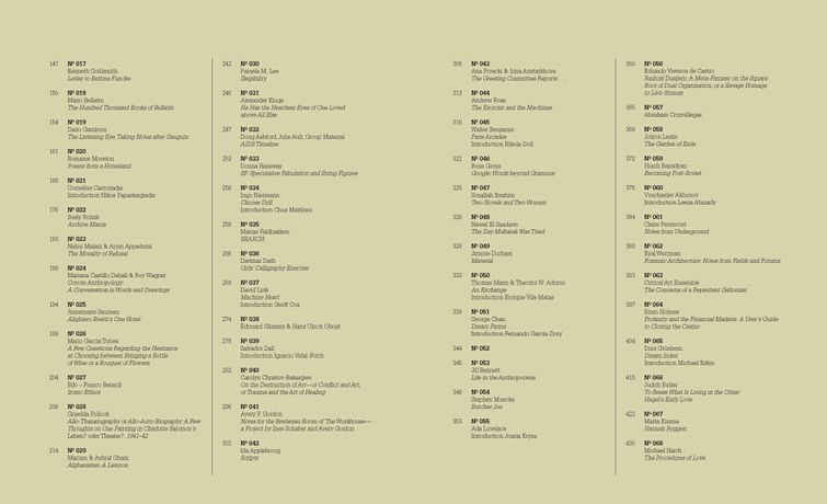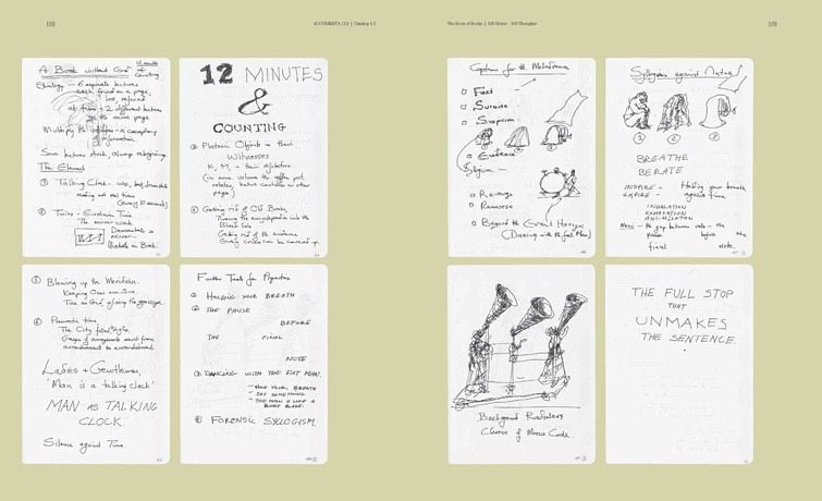 Die Bandbreite der Autoren der Notizbücher reicht von dem Anthropologen Michael Taussig über die Philosophen Donna Haraway und Christoph Menke, die feministische Kulturtheoretikerin Griselda Pollock sowie die politische Philosophin Susan Buck-Morss bis hin zu der Dichterin Romaine Moreton und dem Wissenschaftler Anton Zeilinger und schließt auch zahlreiche Künstler mit ein.