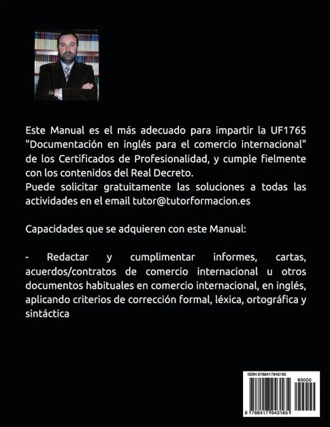 Este Manual es el más adecuado para impartir la UF1765 "Documentación en inglés para el comercio internacional" de los Certificados de Profesionalidad, y cumple fielmente con los contenidos del Real Decreto. >Capacidades que se adquieren con este Manual: - Redactar y cumplimentar informes, cartas, acuerdos/contratos de comercio internacional u otros documentos habituales en comercio internacional, en inglés, aplicando criterios de corrección formal, léxica, ortográfica y sintáctica.