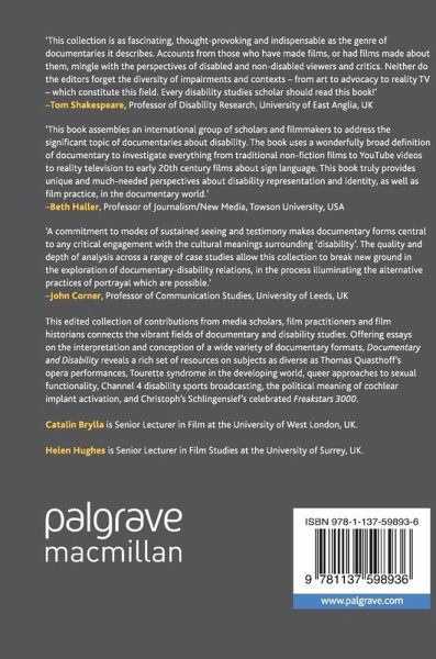 1. Introduction: The Bricolage of Documentary and Disability (Catalin Brylla, Helen Hughes).- 2. Part One: Film Practice - Chapter 2: Not Without Us - Collaborating Across Difference in Documentary Filmmaking (Samuel Avery).- 3. Visual Psychological Anthropology and the Lived Experience of Disability (Annie Tucker, Robert Lemelson).- 4. Valorising Disability on Screen: When did 'Inspirational' Become a Dirty Word? (Veronica Wain).- 5. Spectatorship and Alternative Portrayals of Blindness (Catalin Brylla.- 6. Aberrancy and Autobiographical Documentary (Phoebe Hart).- 7. Part Two: Representation - Chapter 7: Thomas Quasthoff and the Performativity of Disability in Michael Harder's The Dreamer (Anna Drum, Martin Brady).- 8. Rethinking Ability and Disability in the Work of Johan van der Keuken (Hing Tsang).- 9. (Dis)abling the Spectator: Embodying Disability Experience in Animated Documentary (Slava Greenberg).- 10. The Poetics of Touch: Mediating the Reality of Deafblindness in Planetof Snail (Anne-Marie Callus).- 11. Sexual Dissidence and Crip Empowerment in Yes, We Fuck! (Andrea García-Santesmases).- 12. Part Three: Identity, Participation and Exhibition - Chapter 12: Accessing Alternative Ethical Maps of In(ter)depenent Living in Global Disability Documentary (David T. Mitchell, Sharon L. Snyder).- 13. Interface Productions and Disability Programming for Channel 4: 1984 - 1986 (Tony Steyger, Jamie Clarke).- 14. Disability and the Para-TV Communities of Reality Television (Anita Biressi).- 15. Singing Altogether Now: Unsettling Images of Disability and Experimental Filmic Practices (Robert Stock).- 16. To Document is to Preserve: Moving Pictures and Sign Language (Magdalena Zdrodowska).- 17. Documenting Neuropolitics: Cochlear Implant Activation Videos (Beate Ochsner).- 18. On Andrew Kötting's Mapping Perception (Helen Hughes).