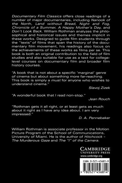 Documentary Film Classics offers close readings on a number of major films, such as Nanook of the North, Land Without Bread, Night and Fog, Chronicle of a Summer and Don't Look Back. Spanning the history of the documentary film tradition, William Rothman analyzes the philosophical and historical issues and themes implicit in these works. Designed to guide film students through the "texts" of a wide range of documentaries, his readings also focus on the achievements of these works as films per se.