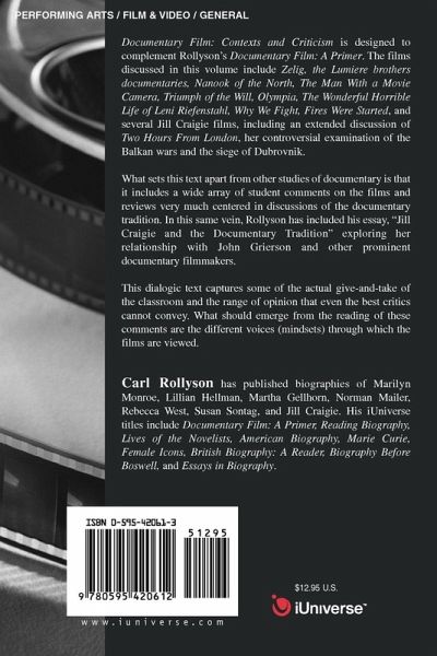 Documentary Film: Contexts and Criticism is designed to complement Rollyson's Documentary Film: A Primer. The films discussed in this volume include Zelig, the Lumiere brothers documentaries, Nanook of the North, The Man With a Movie Camera, Triumph of the Will, Olympia, The Wonderful Horrible Life of Leni Riefenstahl, Why We Fight, Fires Were Started, and several Jill Craigie films, including an extended discussion of Two Hours From London, her controversial examination of the Balkan wars and the siege of Dubrovnik. What sets this text apart from other studies of documentary is that it includes a wide array of student comments on the films and reviews very much centered in discussions of the documentary tradition. In this same vein, Rollyson has included his essay, "Jill Craigie and the Documentary Tradition" exploring her relationship with John Grierson and other prominent documentary filmmakers. This dialogic text captures some of the actual give-and-take of the classroom and the range of opinion that even the best critics cannot convey. What should emerge from the reading of these comments are the different voices (mindsets) through which the films are viewed.
