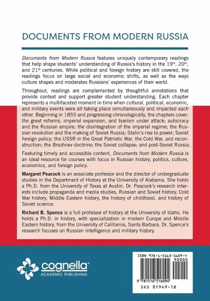 Documents from Modern Russia features uniquely contemporary readings that help shape students’ understanding of Russia’s history in the 19th, 20th, and 21st centuries. While political and foreign history are still covered, the readings focus on large social and economic shifts, as well as the ways culture shapes and moderates Russians’ experiences of their world. Throughout, readings are complemented by thoughtful annotations that provide context and support greater student understanding. Each chapter represents a multifaceted moment in time when cultural, political, economic, and military events were all taking place simultaneously and impacted each other. Beginning in 1855 and progressing chronologically, the chapters cover: the great reforms, imperial expansion, and tsarism under attack; autocracy and the Russian empire; the disintegration of the imperial regime; the Russian revolution and the making of Soviet Russia; Stalin’s rise to power; Soviet foreign policy; the USSR in the Great Patriotic War, the Cold War, and reconstruction; the Brezhnev doctrine; the Soviet collapse; and post-Soviet Russia. Featuring timely and accessible content, Documents from Modern Russia is an ideal resource for courses with focus in Russian history, politics, culture, economics, and foreign policy. Margaret Peacock is an associate professor and the director of undergraduate studies in the Department of History at the University of Alabama. She holds a Ph.D. from the University of Texas at Austin. Dr. Peacock’s research interests include propaganda and media studies, Russian and Soviet history, Cold War history, Middle Eastern history, the history of childhood, and history of Soviet science. Richard B. Spence is a full professor of history at the University of Idaho. He holds a Ph.D. in history, with specialization in modern Europe and Middle Eastern history, from the University of California, Santa Barbara. Dr. Spence’s research focuses on Russian intelligence and military history.