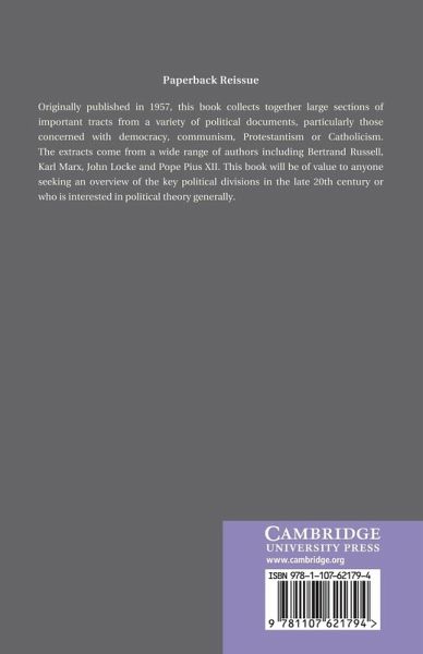 Originally published in 1957, this book collects together large sections of important tracts from a variety of political documents, particularly those concerned with democracy, communism, Protestantism or Catholicism. The extracts come from a wide range of authors including Bertrand Russell, Karl Marx, John Locke and Pope Pius XII. This book will be of value to anyone seeking an overview of the key political divisions in the late 20th century or who is interested in political theory generally.