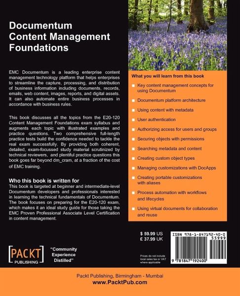 This book teaches the technical fundamentals of the EMC Documentum content management platform, thoroughly preparing beginner and intermediate-level Documentum developers and professionals for the E20-120 exam. Complete coverage of the syllabus, illustrated examples and practice questions on each topic, and two full-length practice tests with answers build the confidence to tackle the real exam successfully. Author Pawan Kumar, founder of free online Documentum community dm_cram, now provides consulting and training services through doQuent. Leading enterprise content management platform EMC Documentum streamlines capture, processing, and distribution of business information and can automate entire business processes in accordance with business rules. Content Management Foundations (CMF) Associate-level Exam E20-120 is the first exam on the EMC Proven Content Management Application Developer (EMCAD) track introduced by the EMC Proven Professional certification program in early 2007.