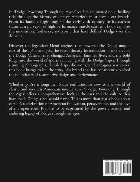 In "Dodge: Powering Through the Ages," readers are invited on a thrilling ride through the history of one of America's most iconic car brands. From its humble beginnings in the early 20th century to its current status as a purveyor of high-performance muscle cars, this book explores the innovation, resilience, and spirit that have defined Dodge over the decades. Discover the legendary Hemi engines that powered the Dodge muscle cars of the 1960s and 70s, the revolutionary introduction of models like the Dodge Caravan that changed American families' lives, and the bold foray into the world of sports car racing with the Dodge Viper. Through stunning photographs, detailed specifications, and engaging narratives, this book brings to life the story of a brand that has consistently pushed the boundaries of automotive design and performance. Whether you're a longtime Dodge enthusiast or new to the world of classic and modern American muscle cars, "Dodge: Powering Through the Ages" offers a comprehensive look at the cars and the culture that have made Dodge a household name. This is more than just a book about cars; it's a celebration of American innovation, perseverance, and the love of the open road. Prepare to be captivated by the power, beauty, and enduring legacy of Dodge through the ages.