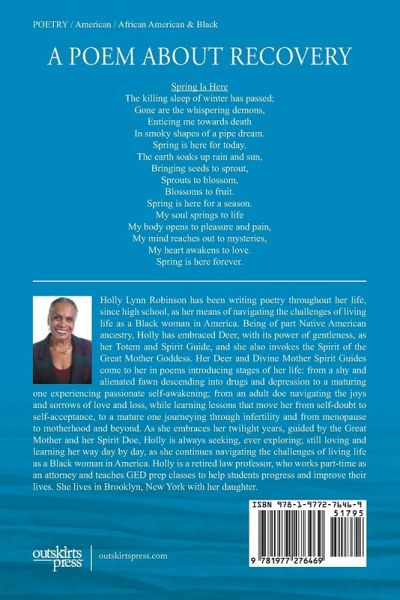 Holly Lynn Robinson has been writing poetry throughout her life, since high school, as her means of navigating the challenges of living life as a Black woman in America. Being of part Native American ancestry, Holly has embraced Deer, with its power of gentleness, as her Totem and Spirit Guide, and she also invokes the Spirit of the Great Mother Goddess. Her Deer and Divine Mother Spirit Guides come to her in poems introducing stages of her life: from a shy and alienated fawn descending into drugs and depression to a maturing one experiencing passionate self-awakening; from an adult doe navigating the joys and sorrows of love and loss, while learning lessons that move her from self-doubt to self-acceptance, to a mature one journeying through infertility and from menopause to motherhood and beyond. As she embraces her twilight years, guided by the Great Mother and her Spirit Doe, Holly is always seeking, ever exploring; still loving and learning her way day by day, as she continues navigating the challenges of living life as a Black woman in America. Holly is a retired law professor, who works part-time as an attorney and teaches GED prep classes to help students progress and improve their lives. She lives in Brooklyn, New York with her daughter.