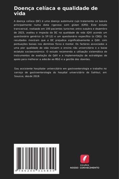 A doença celíaca (DC) é uma doença autoimune cujo tratamento se baseia principalmente numa dieta rigorosa sem glúten (GFD). Este estudo transversal, realizado em 100 pacientes tunisinos entre outubro e dezembro de 2023, avaliou o impacto da DC na qualidade de vida (QV) usando um questionário genérico (o SF-12) e um questionário específico (o CDQ). Os resultados mostram que a DC prejudica significativamente a QdV, com pontuações baixas nos domínios físico e mental. Os factores associados a uma pior qualidade de vida incluem o ensino não universitário e o baixo estatuto socioeconómico. O estudo recomenda a utilização sistemática de instrumentos de avaliação da QdV e a implementação de estratégias de apoio para melhorar a adesão ao RSG e a gestão dos doentes.
