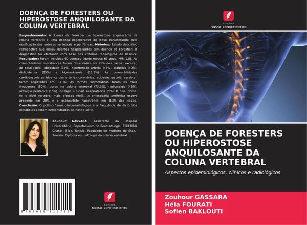 Enquadramento: A doença de Forestier ou hiperostose anquilosante da coluna vertebral é uma doença degenerativa do idoso caracterizada pela ossificação das enteses vertebrais e periféricas. Métodos: Estudo descritivo retrospetivo que incluiu doentes hospitalizados com doença de Forestier. O diagnóstico foi efectuado com base nos critérios radiológicos de Resnick. Resultados: Foram incluídos 60 doentes (idade média: 63 anos, M/F: 1,5). As comorbilidades metabólicas foram observadas em 75% dos casos: excesso de peso (40%), obesidade (34%), hipertensão arterial (45%), diabetes (40%), dislipidemia (25%) e hiperuricemia (13,3%). As co-morbilidades cardiovasculares (doença das artérias coronárias, acidente vascular cerebral) foram registadas em 13,3%. As formas sintomáticas foram as mais frequentes (80%): dores na coluna vertebral (73,3%), radiculalgia (45%), artralgia periférica (15%), disfagia e sinais respiratórios (5%). O nível dorsal foi o nível vertebral mais afetado (90%). A entesopatia periférica esteve presente em 20% e a osteoartrite hipertrófica em 8,3% dos casos. Conclusão: O polimorfismo clínico-radiológico e a frequência de distúrbios metabólicos foram demonstrados na nossa série.