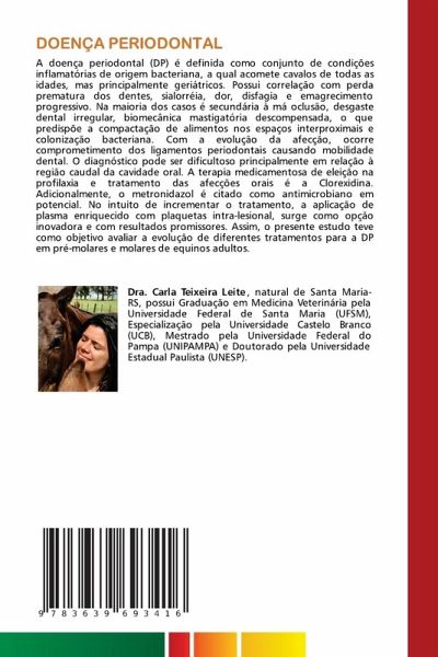 A doença periodontal (DP) é definida como conjunto de condições inflamatórias de origem bacteriana, a qual acomete cavalos de todas as idades, mas principalmente geriátricos. Possui correlação com perda prematura dos dentes, sialorréia, dor, disfagia e emagrecimento progressivo. Na maioria dos casos é secundária à má oclusão, desgaste dental irregular, biomecânica mastigatória descompensada, o que predispõe a compactação de alimentos nos espaços interproximais e colonização bacteriana. Com a evolução da afecção, ocorre comprometimento dos ligamentos periodontais causando mobilidade dental. O diagnóstico pode ser dificultoso principalmente em relação à região caudal da cavidade oral. A terapia medicamentosa de eleição na profilaxia e tratamento das afecções orais é a Clorexidina. Adicionalmente, o metronidazol é citado como antimicrobiano em potencial. No intuito de incrementar o tratamento, a aplicação de plasma enriquecido com plaquetas intra-lesional, surge como opção inovadora e com resultados promissores. Assim, o presente estudo teve como objetivo avaliar a evolução de diferentes tratamentos para a DP em pré-molares e molares de equinos adultos.