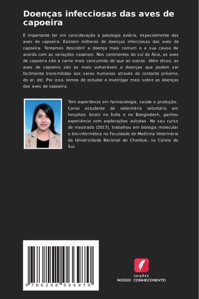 É importante ter em consideração a patologia aviária, especialmente das aves de capoeira. Existem milhares de doenças infecciosas das aves de capoeira. Tentamos descobrir a doença mais comum e a sua causa de acordo com as variações sazonais. Nos continentes do sul da Ásia, as aves de capoeira são a carne mais consumida do que as outras. Além disso, as aves de capoeira são as mais vulneráveis a doenças que podem ser facilmente transmitidas aos seres humanos através do contacto próximo, do ar, etc. Por isso, temos de estudar e investigar mais sobre as doenças das aves de capoeira.
