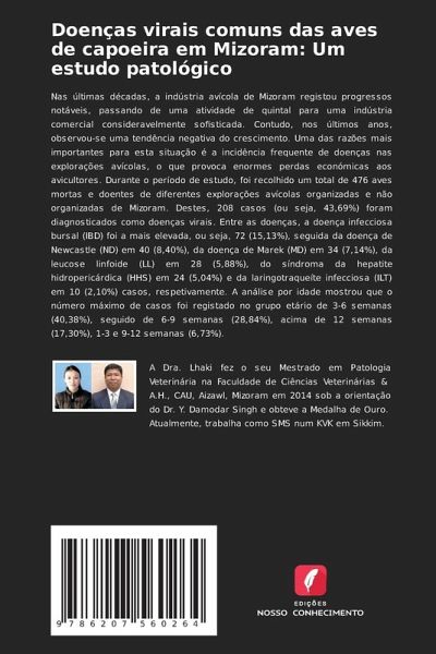 Nas últimas décadas, a indústria avícola de Mizoram registou progressos notáveis, passando de uma atividade de quintal para uma indústria comercial consideravelmente sofisticada. Contudo, nos últimos anos, observou-se uma tendência negativa do crescimento. Uma das razões mais importantes para esta situação é a incidência frequente de doenças nas explorações avícolas, o que provoca enormes perdas económicas aos avicultores. Durante o período de estudo, foi recolhido um total de 476 aves mortas e doentes de diferentes explorações avícolas organizadas e não organizadas de Mizoram. Destes, 208 casos (ou seja, 43,69%) foram diagnosticados como doenças virais. Entre as doenças, a doença infecciosa bursal (IBD) foi a mais elevada, ou seja, 72 (15,13%), seguida da doença de Newcastle (ND) em 40 (8,40%), da doença de Marek (MD) em 34 (7,14%), da leucose linfoide (LL) em 28 (5,88%), do síndroma da hepatite hidropericárdica (HHS) em 24 (5,04%) e da laringotraqueíte infecciosa (ILT) em 10 (2,10%) casos, respetivamente. A análise por idade mostrou que o número máximo de casos foi registado no grupo etário de 3-6 semanas (40,38%), seguido de 6-9 semanas (28,84%), acima de 12 semanas (17,30%), 1-3 e 9-12 semanas (6,73%).