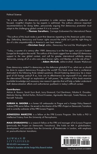 Acknowledgments Introduction, Adrian A. Basora and Kenneth Yalowitz Chapter 1: Democracy Support: Global Challenges and the Importance of U.S. Leadership, Carl Gershman Chapter 2: Realist Counsel on Democracy Promotion, Nikolas K. Gvosdev Chapter 3: A Case for Democracy Assistance and Ways to Improve It, Richard Kraemer Chapter 4: Three Lessons about Democracy Assistance Effectiveness, Sarah Bush Chapter 5: Reforming the Democracy Bureaucracy, Melinda Haring Chapter 6: The Multiplier Effects of U.S. Democracy Promotion, Tsveta Petrova Chapter 7: East Central Europe and the Future of Democracy, Michal Koran Chapter 8: Reviving the Global Democratic Momentum, Larry Diamond Chapter 9: Academic Conclusions, Working Hypotheses, and Areas for Further Research,Agnieszka Marczyk Chapter 10: Policy Conclusions and Recommendations, Adrian A. Basora and Kenneth Yalowitz Glossary Index About the Editors and Contributors