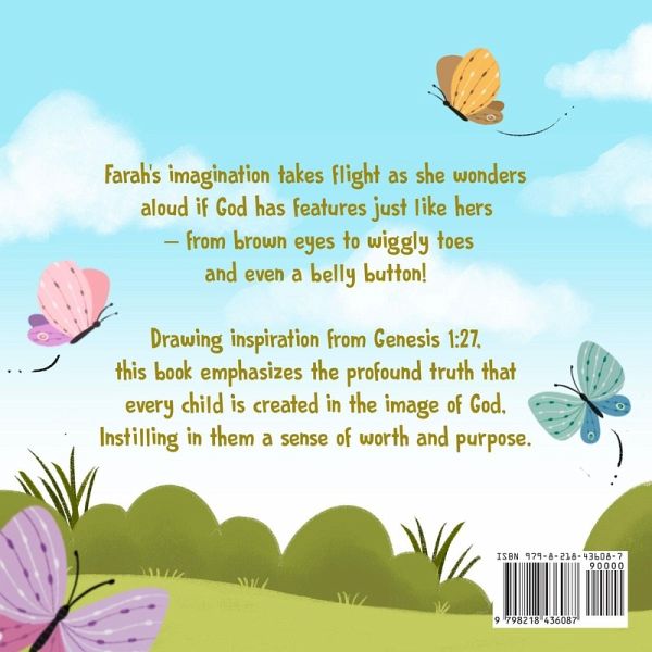 Farah's imagination takes flight as she wonders aloud if God has features just like hers - from brown eyes to wiggly toes and even a belly button! Drawing inspiration from Genesis 1:27, this book emphasizes the profound truth that every child is created in the image of God, instilling in them a sense of worth and purpose. This Christian children's book is useful to help spark conversations with your curious little one!
