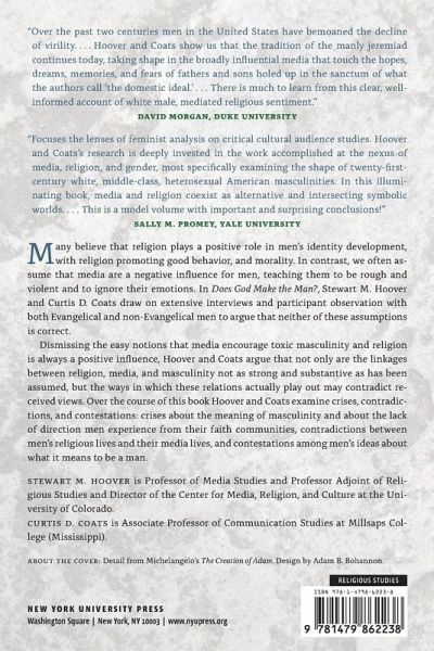Many believe that religion plays a positive role in men's identity development, with religion promoting good behavior, and morality. In contrast, we often assume that the media is a negative influence for men, teaching them to be rough and violent, and to ignore their emotions. In Does God Make the Man?, Stewart M. Hoover and Curtis D. Coats draw on extensive interviews and participant observation with both Evangelical and non-Evangelical men, including Catholics as well as Protestants, to argue that neither of these assumptions is correct. Dismissing the easy notion that media encourages toxic masculinity and religion is always a positive influence, Hoover and Coats argue that not only are the linkages between religion, media, and masculinity not as strong and substantive as has been assumed, but the ways in which these relations actually play out may contradict received views. Over the course of this fascinating book they examine crises, contradictions, and contestations: crises about the meaning of masculinity and about the lack of direction men experience from their faith communities; contradictions between men's religious lives and media lives, and contestations among men's ideas about what it means to be a man. The book counters common discussions about a "crisis of masculinity," showing that actual men do not see the world the way the "crisis talk" has portrayed it-and interestingly, even Evangelical men often do not see religion as part of the solution.