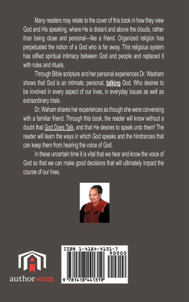 Many readers may relate to the cover of this book in how they view God and His speaking, where He is distant and above the clouds, rather than being close and personal-like a friend. Organized religion has perpetuated the notion of a God who is far away. This religious system has stifled spiritual intimacy between God and people and replaced it with rules and rituals. Though Bible scripture and her personal experiences Dr. Washam shows that God is an intimate, personal, talking God. Who desires to be involved in every aspect of our lives-everyday issues and extraordinary trials. Dr. Washam shares her experiences as though she were conversing with a familiar acquaintance; she speaks "to" us rather than "at" us. Through this book, the reader will know without a doubt that God Does Talk, and that He desires to speak unto them! The reader will learn the ways in which God speaks and the hindrances that can keep them from hearing the voice of God. In these uncertain times it is vital that we hear and know the voice of God so that we can make good decisions that will ultimately impact the course of our lives.
