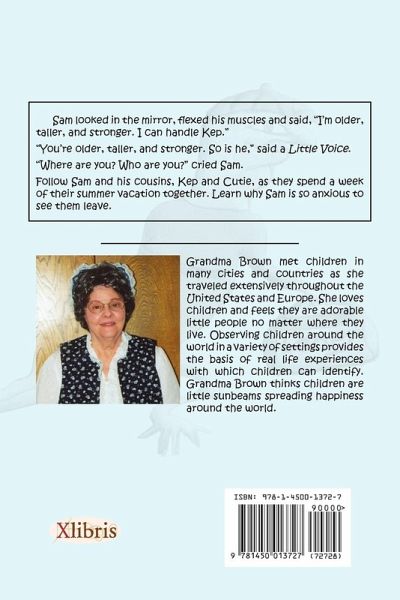 Sam looked in the mirror, flexed his muscles and said, "I'm older, taller, and stronger. I can handle Kep." "You're older, taller, and stronger. So is he," said a Little Voice. "Where are you? Who are you?" cried Sam. Follow Sam and his cousins, Kep and Cutie, as they spend a week of their summer vacation together. Learn why Sam is so anxious to see them leave.