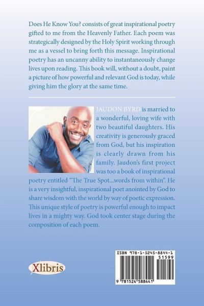 Does He Know You? consists of great inspirational poetry gifted to me from the Heavenly Father. Each poem was strategically designed by the Holy Spirit working through me as a vessel to bring forth this message. Inspirational poetry has an uncanny ability to instantaneously change lives upon reading. This book will, without a doubt, paint a picture of how powerful and relevant God is today, while giving him the glory at the same time.