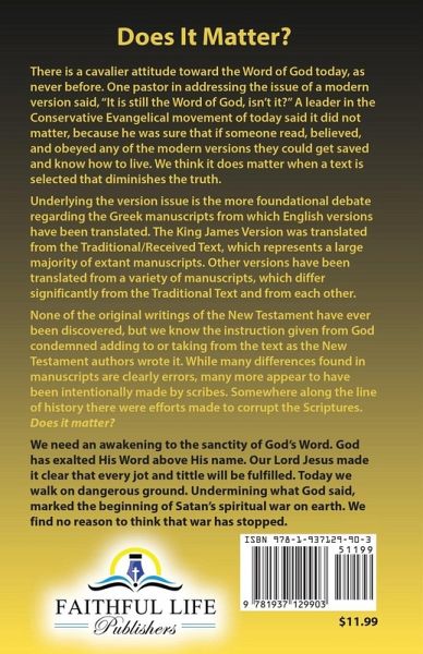 There is a cavalier attitude toward the Word of God today, as never before. One pastor in addressing the issue of a modern version said, "It is still the Word of God, isn't it?" A leader in the Conservative Evangelical movement of today said it did not matter, because he was sure that if someone read, believed, and obeyed any of the modern versions they could get saved and know how to live. We think it does matter when a text is selected that diminishes the truth. When in Luke 2:43, the ESV changes Joseph and his mother to read parents, does it matter? The ESV rendering undermines the virgin birth and Christ's deity. Some will excuse this disgraceful way of handling God's Word, by saying these truths are taught elsewhere; but the writers of God's Word had purpose in their choice of words, which must not be dismissed or ignored. When the ESV takes the warning of II Timothy 3:3, that in the last days, men shall be without natural affection and waters it down to read heartless, does it matter? The ESV rendering destroys one of the most serious warnings of God to His people as we face the last times. We need an awakening to the sanctity of God's Word. God has exalted His Word above His name. Our Lord Jesus made it clear that every jot and tittle will be fulfilled. Today we walk on dangerous ground. Questioning what God said, marked the beginning of Satan's spiritual war on earth. We find no reason to think that war has stopped.