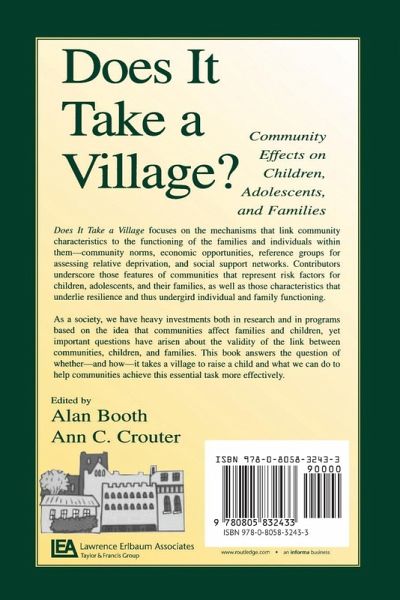 Does It Take a Village? focuses on the mechanisms that link community characteristics to the functioning of the families and individuals within them--community norms, economic opportunities, reference groups for assessing relative deprivation, and social support networks. Contributors underscore those features of communities that represent risk factors for children, adolescents, and their families, as well as those characteristics that underlie resilience and thus undergird individual and family functioning. As a society we have heavy investments both in research and in programs based on the idea that communities affect families and children, yet important questions have arisen about the validity of the link between communities, children, and families. This book answers the question of whether--and how--it takes a village to raise a child and what we can do to help communities achieve this essential task more effectively.