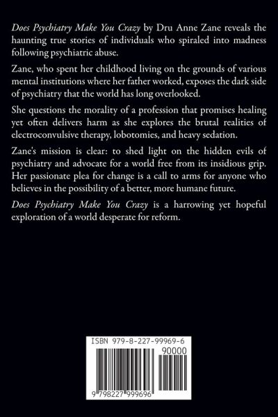 Does Psychiatry Make You Crazy by Dru Anne Zane reveals the haunting true stories of individuals who spiraled into madness following psychiatric abuse. Zane, who spent her childhood living on the grounds of various mental institutions where her father worked, exposes the dark side of psychiatry that the world has long overlooked. She questions the morality of a profession that promises healing yet often delivers harm as she explores the brutal realities of electroconvulsive therapy, lobotomies, and heavy sedation. Zane's mission is clear: to shed light on the hidden evils of psychiatry and advocate for a world free from its insidious grip. Her passionate plea for change is a call to arms for anyone who believes in the possibility of a better, more humane future. Does Psychiatry Make You Crazy is a harrowing yet hopeful exploration of a world desperate for reform.
